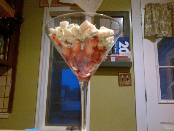 I filled cocktail glasses with a layer of strawberries and blueberries. The Christmas cookie pieces got scattered over the fruit. Then, I mixed one of my favorite last-minute toppings. Sour cream, agave nectar, and honey make a fast, tangy and sweet sauce. A few leaves of mint on top and the cocktail glasses were done.