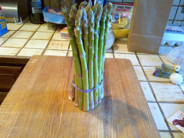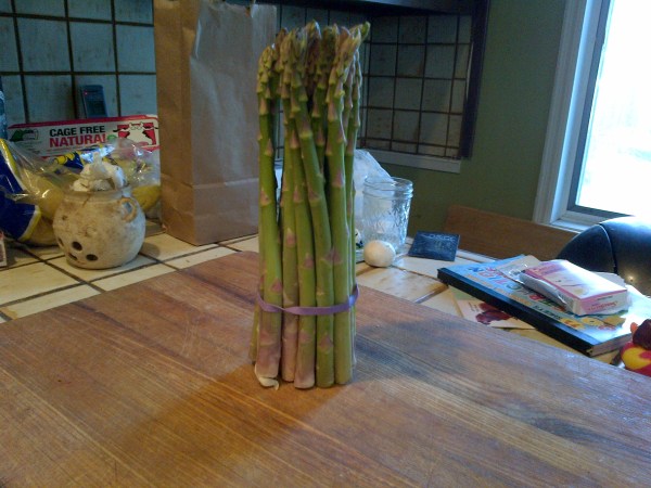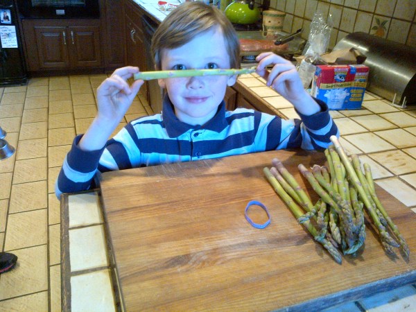 We brought home our first batch of asparagus on Saturday. The guys help me prepare the stalks of asparagus. The first time I showed them, that asparagus will naturally break in the right spot, it was like I did a magic trick.