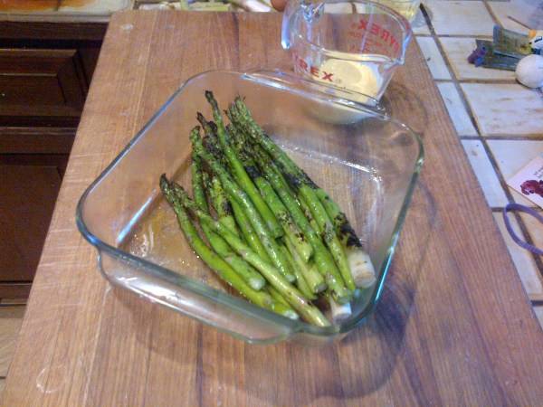 Nothing signals spring like asparagus. Spring was in the air last weekend. We planned a menu with one of the treats of the season. Sometimes we make asparagus with crumbles of hard-boiled egg, with diced red onion, mellowed in red wine vinegar.