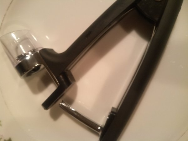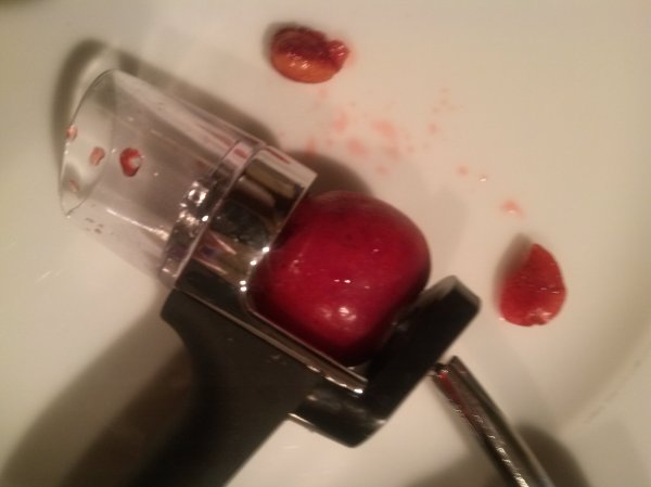 The cherry is placed in the pitter. A simple squeeze of the handle and the spike is driven through the fruit. The pit is extracted. Be sure and check the cherry, when you remove it from the pitter, to make sure the pit is gone. Sometimes it can get left behind.