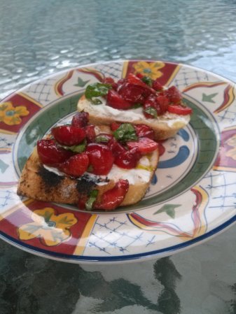 This is a variation of bruschetta featuring our food of the moment. More fun with cherries. Their tartness is paired with some creamy goat cheese and fresh herbs.
