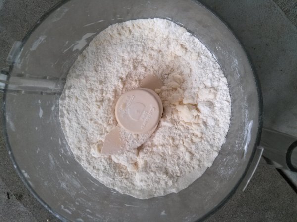 Slice the butter and add to the flour. Pulse a few times until the dough and butter combine. This should look like small pebbles.