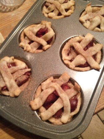 In a separate bowl, combine cherries, some lemon juice, and a dash of honey. Pour the mixture in each of the baked mini pie crusts. You can cut some slices of dough to make a lattice top for the mini pies. Return to oven for about 8-10 minutes to bake the top pieces of dough.