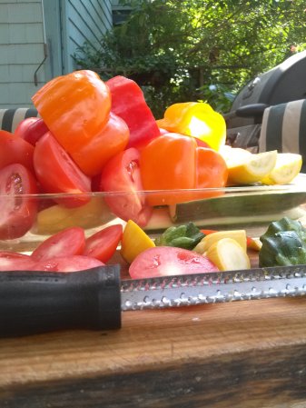 Grilled vegetables and a nice glass of wine. A perfect summer menu for outdoor dining. If you can arrange an evening breeze, and no mosquitoes, you have a thoroughly enjoyable dining experience.