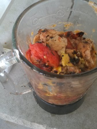 The garlic is done when the bulbs are soft. Allow everything to cool. The garlic will slide easily out of the papery skins. Slice vegetables into pieces. Cover with several cups of cold water. Place in the blender and puree in batches. The chunks of grilled bread will thicken the soup.
