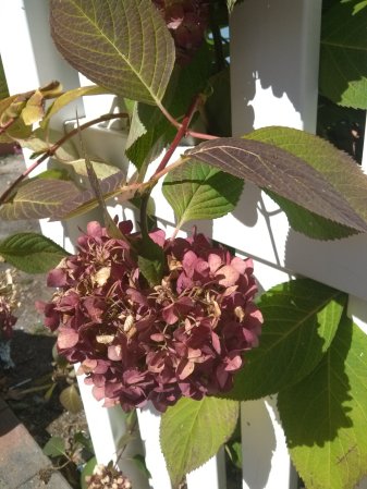 The hydrangea bushes had one last new bloom that appeared. The hydrangea flowers, that spill through the picket fence, dry their own buds on the bush. These will get cut and placed in a vase for the next few months.