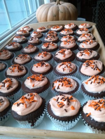A year later, and here we are making cupcakes for our second grade class for their Halloween party. We baked a batch of cupcakes and made sure there were orange and black sprinkles on each one. We saved a few for big brother and little guy licked the spoon when we were done.