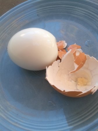Tap the egg on top to release the seal between the egg and the shell. You can then return to the faucet and run cool water over the egg as you peel. The idea behind using the cool water, is to lower the internal temperature of the egg, to stop the cooking of the yolk.