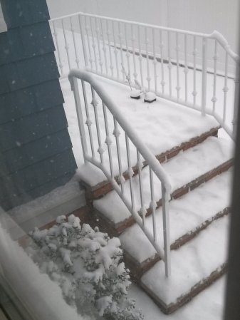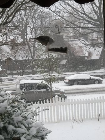 The snow that was predicted for an afternoon debut showed up by early morning. The day was dark, and the snow started to fill corners around the house, as it blew around.