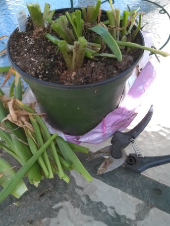 Simply remove from the pot and cut off the spent part of the plant almost down to the soil line.