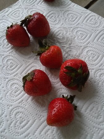 We had picked a number of strawberries on a very hot day and prepared them outside for dessert. A quick rinse in the hose and we sheared off the tops.